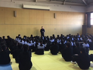 学年集会の様子です。 来週月曜に、服装頭髪検査があります。 週明けになるので、自身でも、確認をしてほしいです。