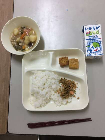 鶏肉とじゃがいもの煮もの、紅ざけそぼろ、あつあげのしょうゆだれかけ、ごはん、牛乳となっています。