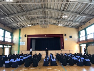 朝、体育館にて学年集会が行われました。