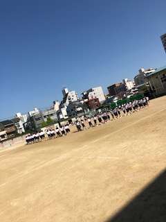 学年全体練習です。フォークダンスの練習をしています。この猛暑の中、元気に頑張っています!素晴らしいですね。