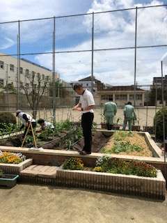 学習園の野菜が元気に育っています。本日はスイカの藁しきを行なっています。
