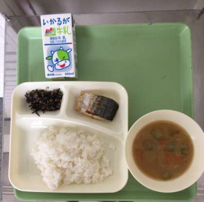さごしの塩焼き、みそ汁、牛ひじきそぼろ、ごはん、牛乳となっております。