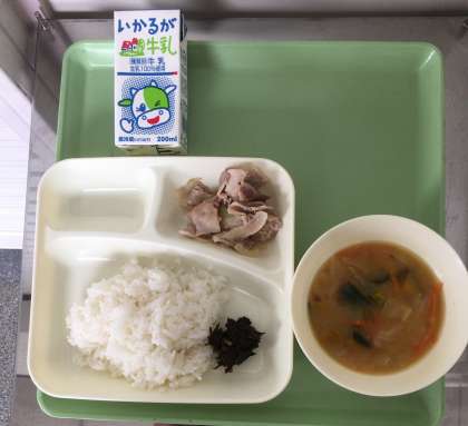 豚肉のゆずの香焼き、みそ汁、のりのつくだ煮、ごはん、牛乳となっております。