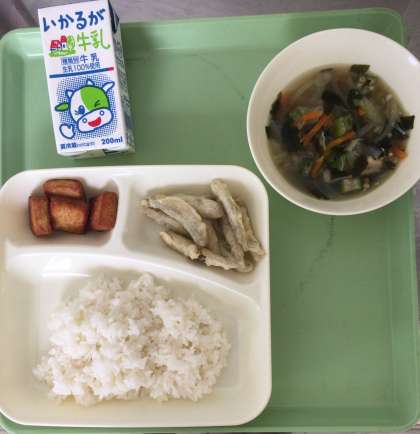いわしてんぷら、五目汁、あつあげのしょうがじょうゆかけ、ごはん、牛乳となっております。