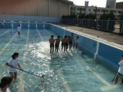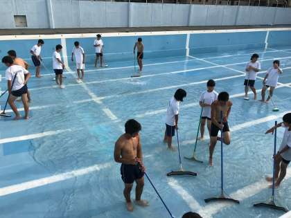 陸上部と男子バスケットボール部の3年生がプール掃除をしてくれています!