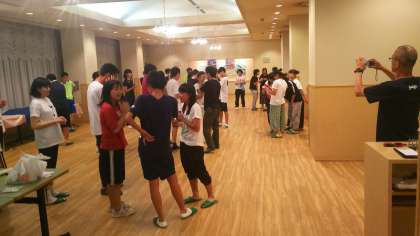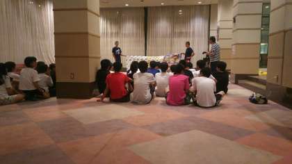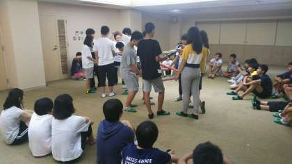 クラスレクです。1組複雑に絡んだタオルから最初の輪っかに戻ります。2組がイラストグランプリ。3組伝言ゲーム。4組誰が隠れてるでしょうか。