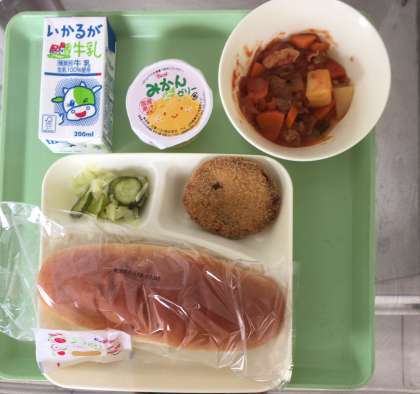 チキンレバーカツ、ケチャップ煮、キャベツときゅうりのサラダ、みかんゼリー、コッペパン、牛乳となっております。