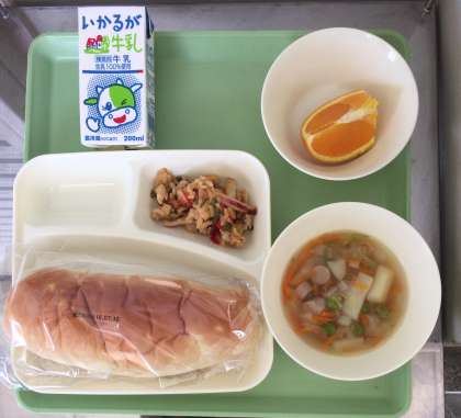 パエリア、ウィンナーとキャベツのスープ、オレンジ、おさつパン、牛乳となっております。