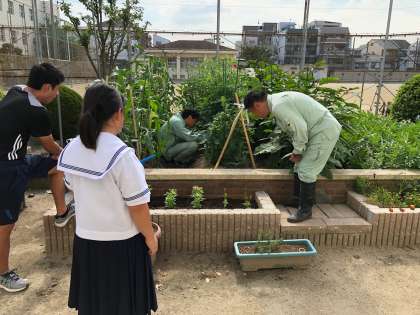 立派に実った野菜には沢山の虫が寄ってくるので、管理作業員さんが見て下さっています。