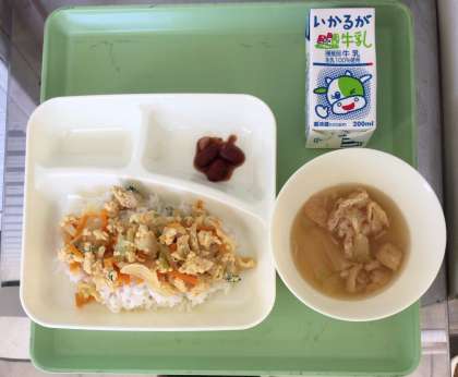 親子丼、とうがんのすまし汁、金時豆の煮もの、ご飯、牛乳となっております。