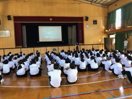 今月に行われる1年生校外学習の説明を真剣に聞いています。
