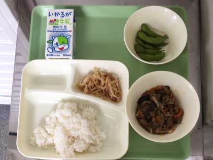 マーボーなす、もやしのごま酢あえ、枝豆、ごはん、牛乳となっております。