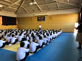本日の学年集会は、明日の校外学習に向けての、服装頭髪検査でした。