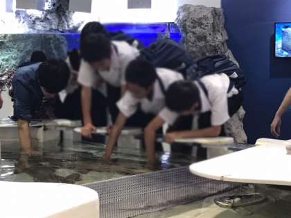 館内見学後、エイとサメのふれあいコーナーで魚を触ったり、