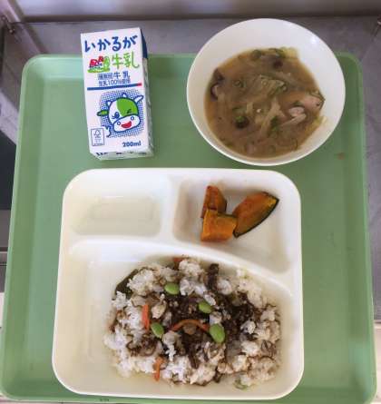 もずくと豚ひき肉のジューシー、みそ汁、焼きかぼちゃの甘みつかけ、ご飯、牛乳となっております。
