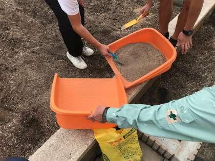 秋植えに向けて、苦土石灰をまいて、土壌を中性に戻します。皆、積極的に取り組んでいます。