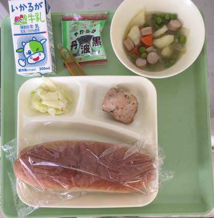 鶏肉の香草焼き、スープ煮、サワーキャベツ、ソフト黒豆、パン、牛乳となっております。