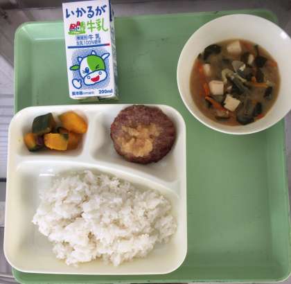 和風おろしハンバーグ、みそ汁、かぼちゃのいとこ煮、ご飯、牛乳となっております。
