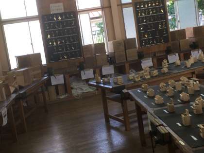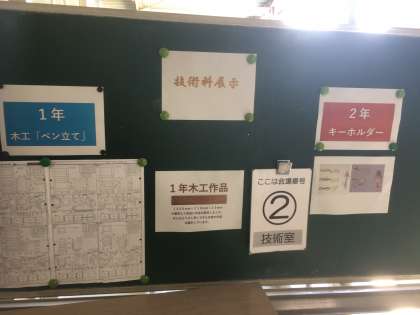 技術室の様子です。1年生の制作した「木工作品」と2年生の制作した「キーホルダー」を展示しました。