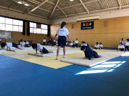1年生体育の様子です。 女子はマット運動、男子はサッカーをしています。