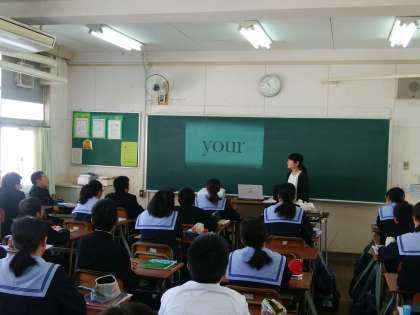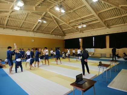 3時間目は、1年生の英語と3年生のマット運動の研究授業です。タブレットやプロジェクターを活用し、生徒の興味、関心を高めています。