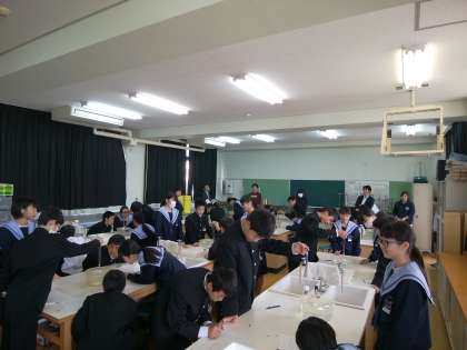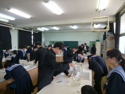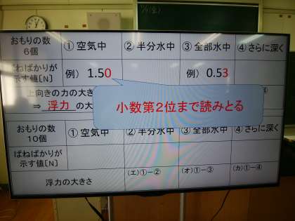 4時間目は1年生、理科の研究授業です。水中で物体にはたらく浮力について理解するために実験しています。