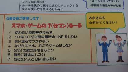 保健委員が決めた、「スマホ・ゲームの7(セブン)るーる」や柔道部・ラグビー部員にも協力してもらったノーメディアデーは、皆さんにもぜひ挑戦してもらいたいです。