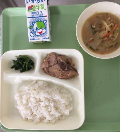なまりぶしのしょうが煮、みそ汁、ほうれん草のごまあえ、ご飯、牛乳となっております。