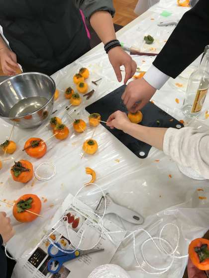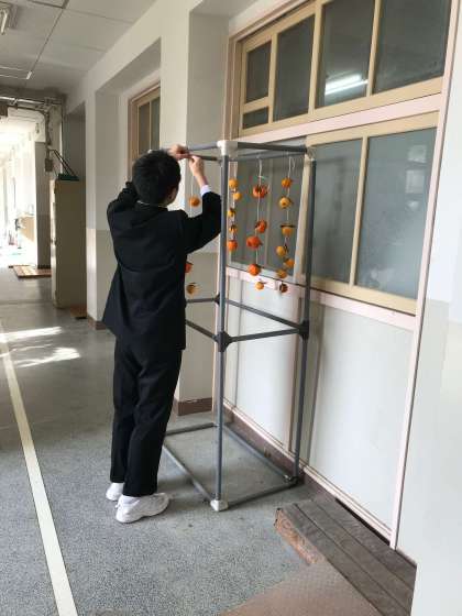 学習室では、保健室の先生のご協力いただき、校庭にある柿の木から採れた柿を使い、干し柿を作っています!