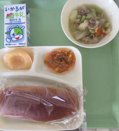 豚肉と野菜のスープ煮、変わりピザ、白桃、パン、牛乳となっております。
