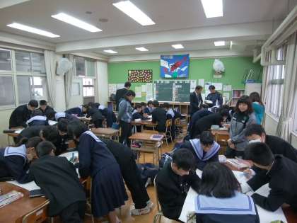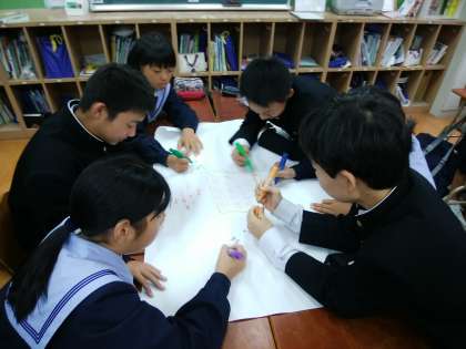 2時間目、1年生社会の研究授業です。古墳の広まりと大和朝廷について、班で調べ学習をしています。