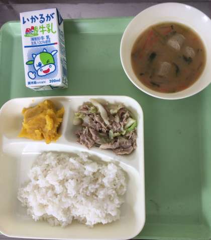 豚肉とまいたけのいためもの、つみれ汁、かぼちゃういろう、ご飯、牛乳となっております。