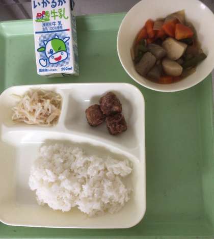 くじらのたつたあげ、さといもと野菜の煮もの、もやしのゆずの香あえ、ご飯、牛乳となっております。