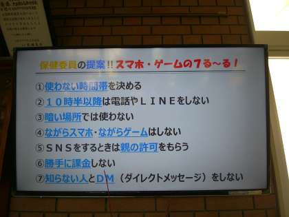 保健委員会から 公開日 2018/11/30 更新日 2018/11/30 お知らせ 保健委員会から携帯電話、スマートフォンの使用について7つのルールを提案してくれています。 正しく利用して、トラブル防止や毎日の生活に支障のないようにしましょう。 いいね(0)