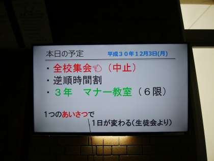 12月3日(月) 公開日 2018/12/03 更新日 2018/12/03 お知らせ いよいよ師走になりました。2学期も残りわずか、気を引き締めて過ごしましょう! 本日、3年生は進路面接に向けて、6時間目マナー講習会を行います。 いいね(0)