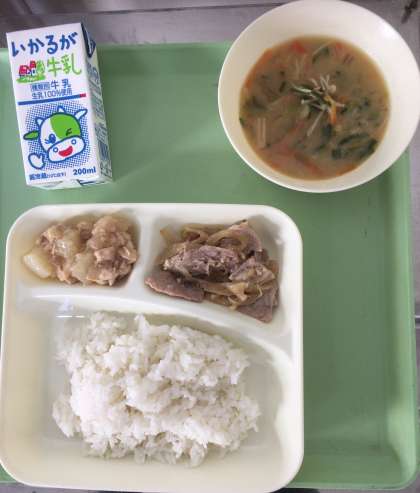 豚肉のしょうが焼き、みそ汁、だいこんの煮もの、ご飯、牛乳となっております。