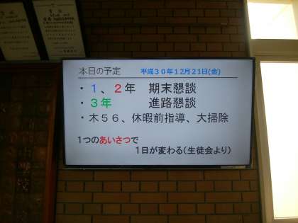 本日は、各学年、冬休み前の事前指導と大掃除です。 来週火曜日は2学期終業式です。
