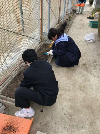 管理作業員の方と一緒に学校の花壇に花を植えています。明日も行う予定です!