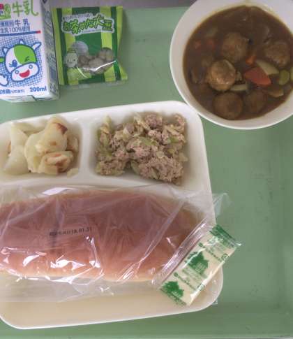 1月31日(木)給食献立 公開日 2019/01/31 更新日 2019/01/31 お知らせ ミートボールと野菜のカレー煮、ツナとキャベツのソテー、焼きじゃが、まっ茶大豆、パン、牛乳となっております。 いいね(0)