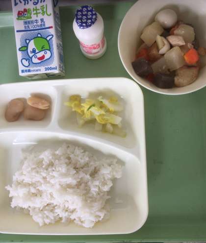 関東煮、はくさいの甘酢づけ、白花豆の煮もの、発酵乳、ご飯、牛乳となっております。