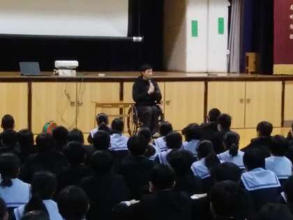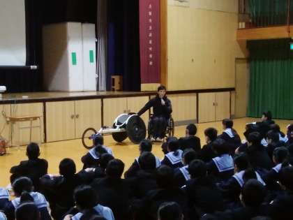 6時間目、パラリンピックを目指しておられる岸澤さんを講師に迎え、ご自身の車いす生活のお話しや、バリアフリーについて、また学生のうちに様々なことにチャレンジしてほしいことなど、たいへんわかりやすくお話ししていただきました。