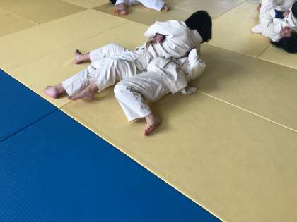 1年生女子体育の様子です。 柔道の授業で、袈裟固めの練習をしています!