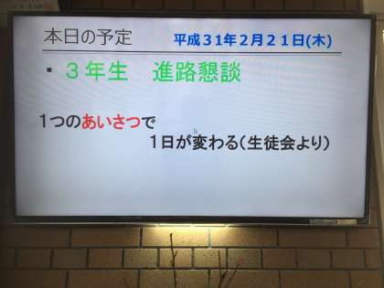 2月21日(木) 公開日 2019/02/21 更新日 2019/02/21 お知らせ 本日、3年生進路懇談の最終日です。 最近はインフルエンザだけでなく、麻疹も流行しています。麻疹は高熱と発疹が症状として出るそうです。対策としては、ワクチンを2回接種することのみですので、ワクチン接種状況について、各ご家庭でもご確認ください。 いいね(0)
