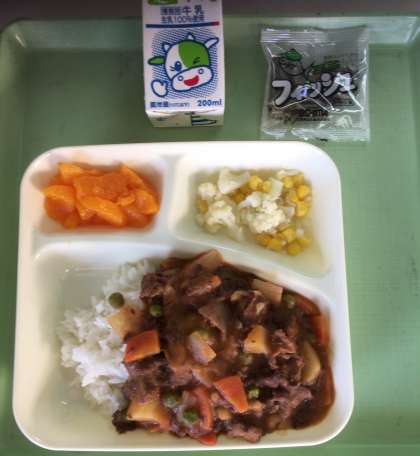 ハヤシライス、カリフラワーとコーンのサラダ、みかん(缶)、ミニフィッシュ、ご飯、牛乳となっております。