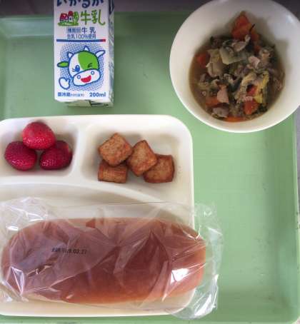 豚肉と白菜のうま煮、あつあげのピリ辛じょうゆかけ、いちご、パン、牛乳となっております。