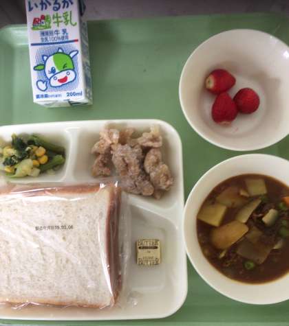 フライドチキン、カレーシチュー、春のカラフルソテー、いちご、パン、牛乳となっております。