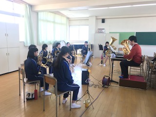 大阪市音楽団の先生が来られ、金管楽器の部員がレッスンを受けている様子です。