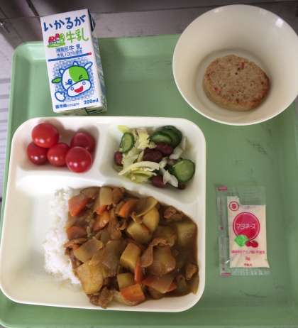 3月11日(月)給食献立 公開日 2019/03/11 更新日 2019/03/11 お知らせ チキンカレーライス、とうふハンバーグ、金時豆と野菜のサラダ、プチトマト、ご飯、牛乳となっております。 いいね(0)