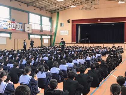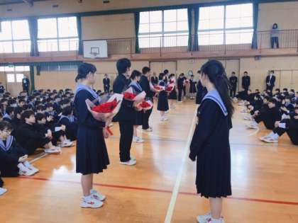 それぞれ代表生徒から送る言葉と別れの言葉があり、最後には花束が3年生に渡されました。