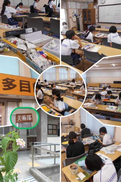 美術部は、夏休みの活動においては、エアコンのある多目的室を使って作品作りに励んでいます。水彩画や油絵など作成途中ですが、素晴らしい作品になるのではと期待が膨らんでいます。楽しみです。